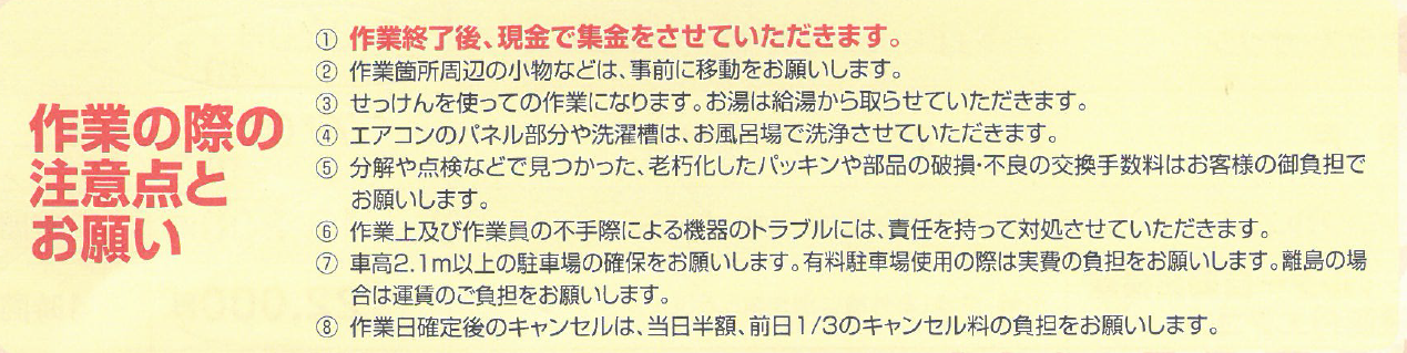 ※水廻りの作業には、組み合わせで割安になる価格の設定があります。お問合せ下さい。作業時間は、台数が多い時や他の作業との組み合わせの時には複数人数で作業時間を短縮いたします。