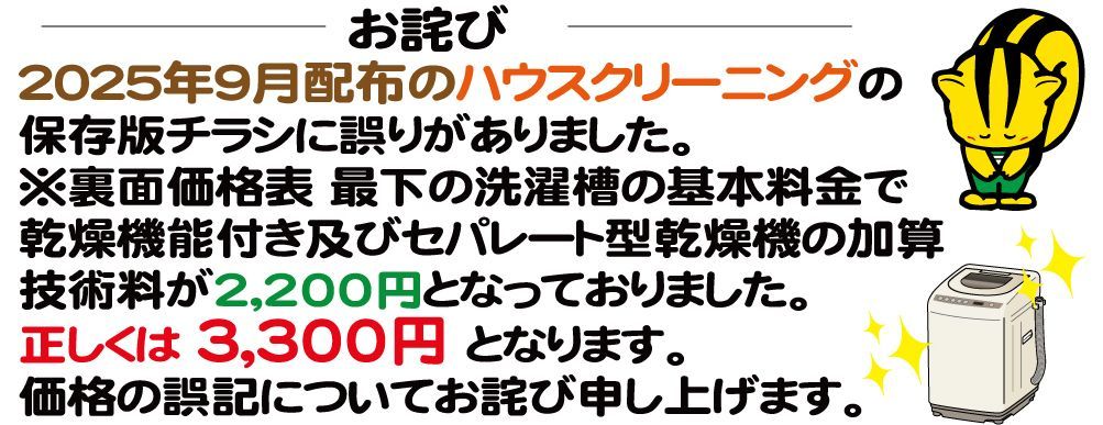 ※乾燥機能付及びセパレート型乾燥機は技術料3,300円加算されます。